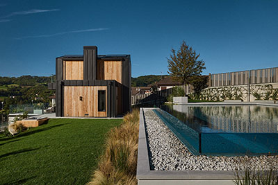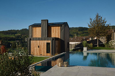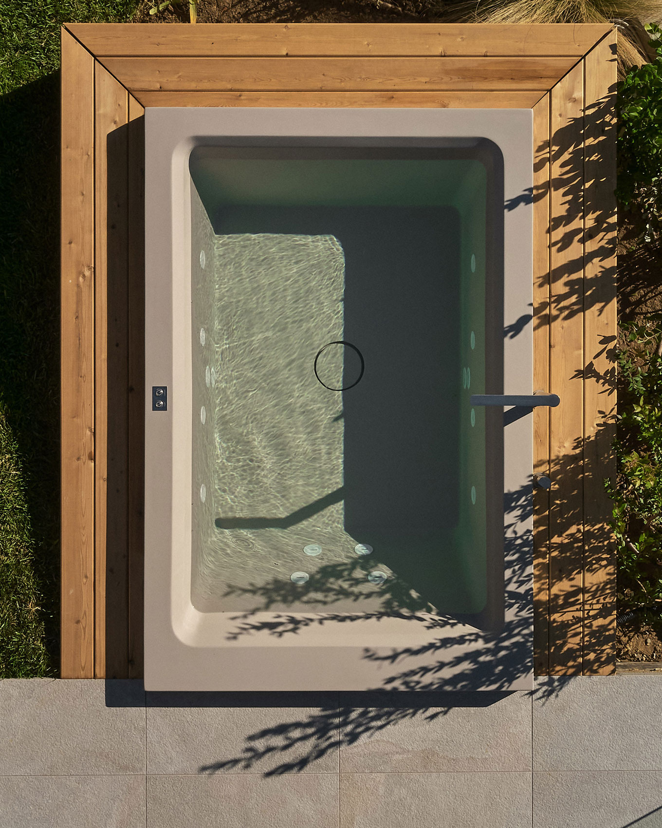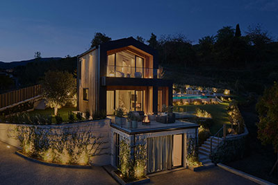 All’esterno il prato e le aree verdi che circondano lo Chalet, sono il cuore pulsante del progetto. L’ampia piscina a sfioro di acqua salata si sviluppa in due altezze e gode di una spiaggetta dove i lettini di design sono immersi direttamente in acqua, ricordando il bagnasciuga. La cucina esterna realizzata in travertino è dotata di fornelli, mini frigo e forno a legna. Di fronte si trova l’ampio tavolo di oltre 3 metri, realizzato con la stessa pietra e progettato per godere di indimenticabili cene estive. La vasca idromassaggio riscaldata completa l’area wellness.